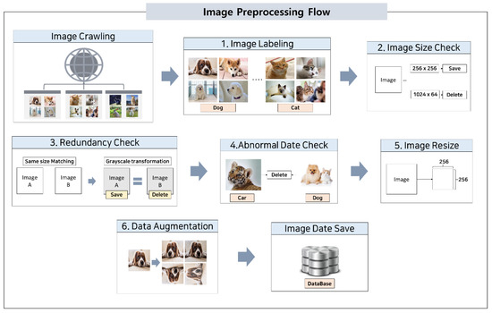 Figure 2. The data preprocessing module followed this order: first, images collected through crawling were labeled around the keywords used in searches; second, collected image data were checked for a horizontal length:vertical length ratio, and images of big ratio differences were removed; third, images of the same size were selected to check image redundancy. The images were then converted on Grayscale and compared in structure. Images of the same structure were removed except for one; fourth, an agreement between images and labels was assessed through manual work. Each image was assessed for objects of two keywords or more used in data collection. Images with such objects were eliminated; fifth, images were converted in the same size for the learning and testing of a CNN model; sixth, data were enlarged through the rotation and distortion of images to increase the amounts of image data.