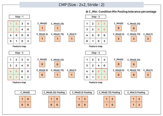 The CMP was designed based on min pooling for its operation. The old min pooling technique extracts a minimum value with a representative value of a window. It can, thus, remove many characteristics when there is a feature value of 0 nearby. In this study, a CMP was proposed that statistically restricted the process of extracting feature values in min pooling.