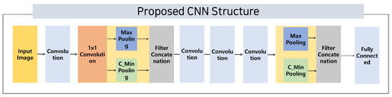 Figure 4 shows the proposed pooling structure, which uses a convolution of 1 × 1 to reduce the number of channels by half before a feature map passes through a restructured pooling layer. The restructured pooling layer was organized in two steps to make use of two pooling techniques with max pooling and CMP applied to be combined in a feature map. After three convolution layers, it passes through max pooling and CMP in a restructured pooling structure once again. Two feature maps identified through pooling layers combine the channels in a feature map without reducing their number and send them to a fully connected layer. The detailed structure of the neural network is shown in