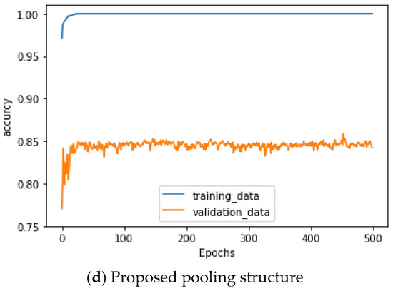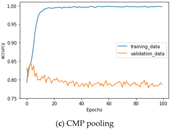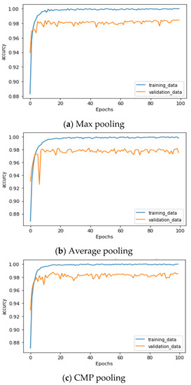 Figure 8 shows the final performance results of the three models. Average pooling recorded the lowest performance based on accuracy rates and loss value. Max pooling and CMP showed similar performance results, but there were differences in loss values between max pooling at 0.1021% and CMP at 0.0817%. A structure using CMP recorded higher performance results than max pooling.