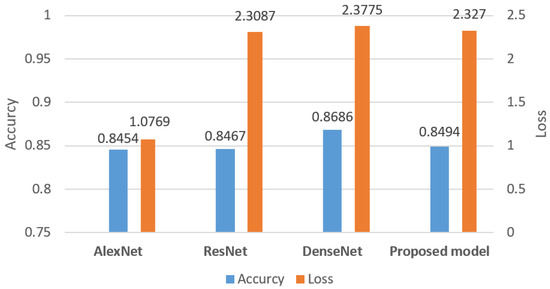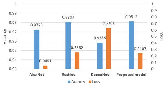 Figure 14 shows the final performance test results of crawling data after learning. DenseNet recorded the highest accuracy rate at 0.8686%, being followed by the proposed pooling structure at 0.8494%. AlexNet recorded the lowest error rate at 0.8454, being followed by the proposed pooling structure at 2.327.