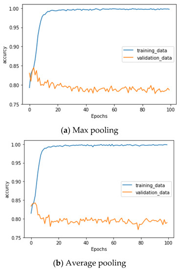 Figure 7 shows the performance results of pooling with Caltech data. On the graph, the x and y axes represent epoch and accuracy rate, respectively. The blue and orange lines represent the accuracy rates of learning and testing data, respectively.