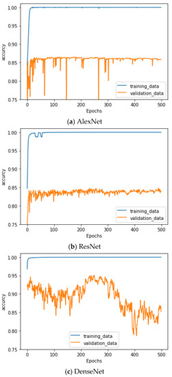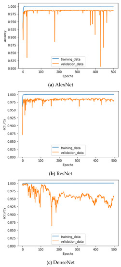Meanwhile, Figure 14 shows the final performance test results of crawling data after learning. DenseNet recorded the highest accuracy rate at 0.8686%, being followed by the proposed pooling structure at 0.8494%. AlexNet recorded the lowest error rate at 0.8454, being followed by the proposed pooling structure at 2.327.