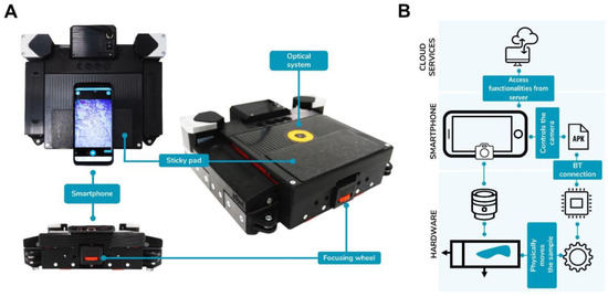 (A) Overview of the design of the proposed device. The phone is placed so it is aligned with the optics. Focusing wheel is used to move the vertical axis of the system for optical focus. (B) Interaction between the 3 main components of the device, including the hardware, the smartphone and cloud services.