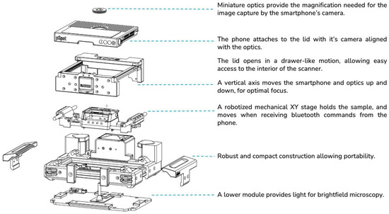 Its compact design allows for physical portability, while its conceptualization around the smartphone hardware allows for connectivity, portability, and ease of use. Both the phone and device are combined in a compact package that is convenient for its operation in remote areas, by non-specialized personnel. Additionally, the proposed robotic microscope scanner is also connected to a telemedicine platform enabling remote diagnosis and analysis of digitized samples.