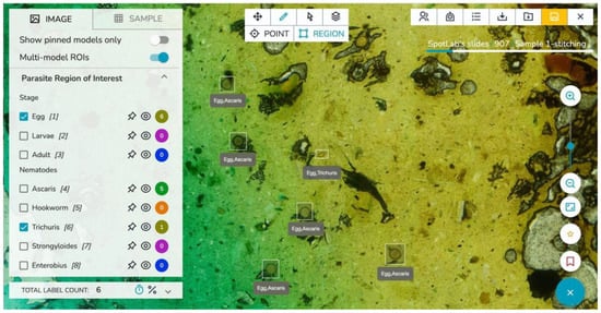 Screenshot of the remote telemedicine platform (developed by the authors) which allows users to navigate and zoom the image, perform annotations, quantify relevant objects and provide overall diagnostic assessments. The sample shown in this example is a Kato-Katz preparation.