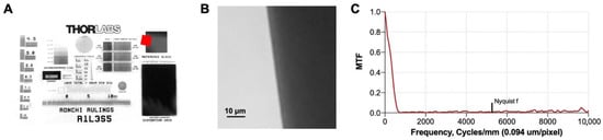 (A) R1L3S5P resolution test target, (B) Slanted test image (red rectangle from resolution target), (C) Modulation transfer function (MTF).