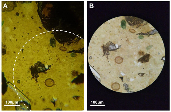 Comparison of images obtained from the same sample (Kato-Katz preparation) using (A) our proposed robotic microscope and (B) a conventional microscope (Leica DM-2000, 40× objective, field number 22). Both images were digitized using a Samsung S9. Note that the dashed line in panel A represents the digitized field of view presented in panel B.
