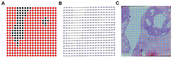 (A) Array of 20 × 20 independent images. Red dots represent successful registration between adjacent images, black dots represent unregistered images (background areas without significant features). (B) Scanner path. Unregistered images (white dots) are interpolated from the grid of registered images (blue dots). (C) Voronoi diagram representing the final stitched result.