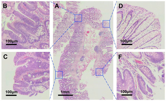 (A) Stitched scan image (20 × 20 grid) of a colon tubular adenocarcinoma histology sample. (B–F) High magnification images showing different structures of interest.