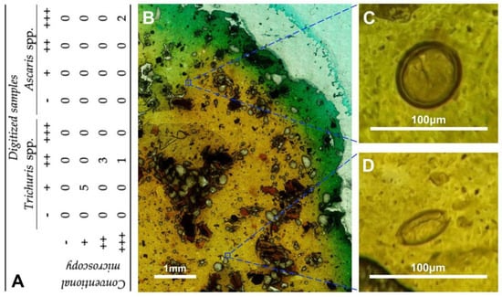 (A): Confusion matrix between intensity of infection performed by conventional microscopy and based on digitized samples. (B): Automated 20 × 20 grid scan from a Kato-Katz slide of a stool sample. (C): High magnification image showing Ascaris spp. egg. (D): Magnification image showing Trichuris spp. egg.