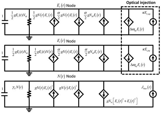 Although the rate equations based on photon number have been widely used in the optical simulation of lasers including OIL lasers [5], we modify the photon-based equations into electric field-based equation and rearrange the rate equations as (5)–(7). Electrical-field-based rate equations can be utilized, such as an optical phased array [23] and optical advanced modulation [24], which should consider optical interference. Moreover, we show that these field-based equations are suitable for the inclusion of optoelectronic device models in a SPICE-based electrical simulation framework [25,26]. Figure 2 shows the equivalent circuit of the OIL laser with , , and as nodes. Each node is connected by a dependent voltage source connector that is omitted in Figure 2.
