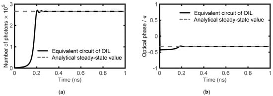 (a) Number of photons of the OIL laser; (b) optical phase of the OIL laser. The solid lines are SPICE simulation results based on our equivalent circuit model and the dashed line represents steady-state values calculated by analytic derivation.