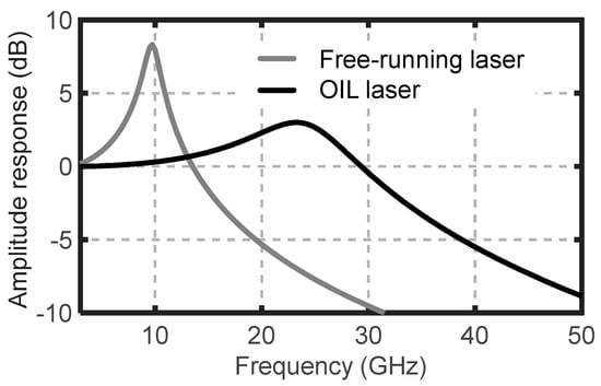 Figure 4 shows the simulation results of the frequency responses of the free-running and OIL lasers. The relaxation oscillation frequency of a free-running laser is approximately 9.76 GHz and that of the OIL laser is approximately 23.255 GHz. Although the modulation bandwidth is more than doubled, a flat and broad 3-dB bandwidth is a more desirable characteristic for the optical source in various optoelectronic applications [31]. To meet this requirement, we designed a bandstop filter to suppress the relaxation oscillation during modulation and achieve a flat 3-dB bandwidth.