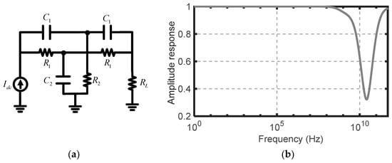 Figure 6a presents the schematic of the twin-T filter used as a bandstop filter to suppress the 25 GHz relaxation oscillation, and Figure 6b shows the frequency response of the bandstop filter. The bandstop filter with specific insertion loss and 3 dB bandwidth (or quality factor, Q-factor) should be designed and inserted in accordance with the frequency response of the OIL laser to minimize the effect of the unwanted strong relaxation oscillation. The frequency response of the OIL laser depends on the injection locking parameters [10]. Figure 7a shows the transient response of the OIL laser with and without the preprocessing of the direct modulation signal based on the bandstop filter. The input bias current is modulated from 5 × Jth to 6 × Jth at 10 ns. We focus on the elimination of the transient oscillation of the optical signal for the modulation current change from 5 × Jth to 6 × Jth in the simulation. The electrical filter should be carefully tuned or designed in accordance with such modulation parameters including the modulation depth, modulation speed, and modulation format. The equivalent circuit model reveals that the relaxation oscillation is significantly reduced by the application of the bandstop filter. The calculated damping ratio exhibits an increase of 0.101 (280%) from 0.056 to 0.157, and the settling time (1%) shows a decrease of 0.055 ns (44.6%) from 0.108 to 0.053 ns, respectively. Figure 7b shows the frequency response of the OIL laser with and without the preprocessing of the direct modulation signal based on the bandstop filter. It shows a wide and flat 3 dB bandwidth of 28.79 GHz as a result of the preprocessing of the direct modulation signal.