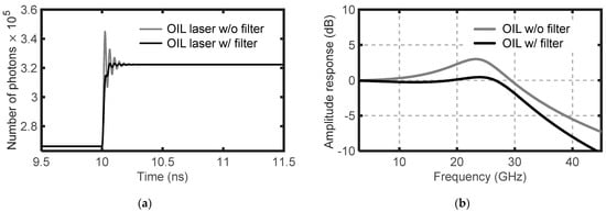 (a) Transient response and (b) frequency response of the directly modulated OIL laser with and without preprocessing of direct modulation signal based on the bandstop filter.
