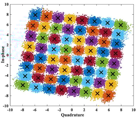 As an example, the transmitting and receiving procedure for 64-QAM is as follows. The bit stream to be transmitted is modulated into optical 64-QAM signal at the transmitter, and then the numerical solution of GNLSE using SSFT algorithm to simulate the optical pulse propagation in SMF is calculated. N symbols affected by dispersion and NLPN are received at the receiving end and classified using the principle of the above-mentioned K-means. The acquired centroid is one-to-one corresponding to the points of the ideal 64-QAM constellation to complete the demodulation. Figure 2 shows the cluster classification result after deploying the K-means algorithm to 64-QAM; it is evident that even if the optical signal phase rotated seriously, the algorithm could still classify and demodulate constellation points more accurately.