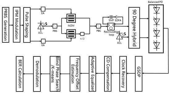 To verify the performance of the K-means cluster algorithm applied for the IPM modulation format scheme, the simulation system of a single carrier system for the data center interconnection network was established, as shown in Figure 3. Additionally, the parameters of the system are listed in Table 1. At the transmitter, the iterative polar quantization procedure was run to generate the transmitted initially constellations. We generate three constellations here, and the order of these constellations is equal to 16, 64, 256, respectively. Random pseudo-random binary sequences (PRBS) are generated in MATLAB and sent to the modulator to realize IPM modulation. The modulated signals are shaped by root raised cosine filter, which roll-off factor is equal to 0.25. After pulse shaping, signals are split up into two streams, amplified by electrical amplifiers (EA), and sent to one of the branches of Mach-Zehnder Modulator (MZM). Another branch is driven by External Cavity Laser (ECL), which operates at 1550 nm and its linewidth is 0.1 MHz. Polarization beam splitter (PBS) divide the optical source into two orthogonal polarization beams. Those two orthogonal polarization beams and two streams of data signals interact on MZMs to produce the modulated optical signals combined as optical wave by polarization beam combiner (PBC). Multi-span fiber link consists of recirculation loop, single-mode (SMF) fiber with a length of 100 km, and erbium-doped fiber amplifier (EDFA) with the gain of 20 dB. The main parameters of SMF are chromatic dispersion (CD), attenuation, and nonlinear coefficient, which is equal to , , and , respectively. At the receiving end, an optical source generated by another ECL drives the balanced photodetector (PD) after hybrid to complete the process of coherent receiving.