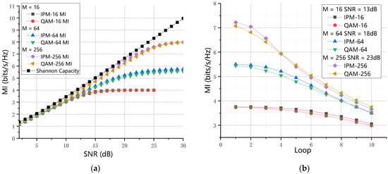 To study the performance of channel capacity of different orders of IPM and QAM modulation format, we quantify it by using the physical amount of mutual information. MI versus SNR of different modulation formats after 100 km transmission is shown in Figure 4a. The line with black diamonds is the Shannon capacity. We can find out that MI in IPM outperforms QAM modulation. Moreover, the larger the modulation order is, the closer the distance IPM is to the Shannon Capacity, especially in IPM-256, the purple line in Figure 4a. The MI versus recirculation loops are shown in Figure 4b. We consider the range of the loop is 1 to 10, length of each loop is 100 km. The results show that when employing IPM-16 and QAM 16, the MI is almost the same at loop = 1 and 2. When transmission distance is small, the nonlinear effect is not accumulated too much; when increasing the loop, the MI of IPM-16 is larger than QAM-16, which indicates that IPM-16 could carry more information. When M = 64, the capacity of IPM outperforms QAM even at the larger loop. It indicates that the average power of IPM-64 has a much lower value and has good tolerance to the dispersion, nonlinear effect, and other noises of SMF. When M = 256, the MI of IPM outperforms QAM at loop = 1 to 4; the performance of IPM is not better than QAM when loop > 4. However, as we all know, the distance between DC is usually no more than 100 km. Therefore, the IPM-256 is also suitable for the data center interconnection network.