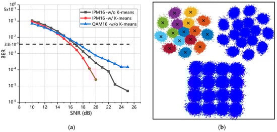We evaluate the BER performance of IPM-16 and QAM-16 with K-means or BPS in different SNR ranges at loop = 5, as shown in Figure 5a, and the recovery constellations SNR = 16 dB are shown in Figure 5b. The BER decreases as the SNR increases, and it is evident that IPM-16 with K-means algorithm outperforms IPM without K-means and QAM-16. The hard-decision FEC (HD-FEC) threshold is , which is mainly used to evaluate the BER performance. Specifically, when SNR is small, the performance of these three schemes is approximately equal. Even the performance of QAM-16 is better than IPM at SNR = 10 to 13. With the increase in SNR, the advantages of the IPM scheme gradually appear. It is clear that IPM with K-means reach the HD-FEC threshold at SNR = 16, while the SNR of reaching the threshold of IPM without K-means and QAM-16 is 16.9 dB, 17.7 dB, respectively. Therefore, the gain of proposed schemes is 0.9 dB, 1.7 dB compared with IPM-16 without K-means cluster algorithm and QAM-16. In the diagram of recovery constellations, the black cross is the centroid locations after a serious iteration, and the centroid could provide a reference for subsequent demodulation.