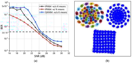 To study the BER performance of IPM-64 and QAM-64, we draw the curves of BER versus SNR, as shown in Figure 6a. The BER gradually decreases as the SNR increases, and there is a positive correlation between BER and SNR. Additionally, it could be seen that the proposed scheme is superior to IPM-64 without K-means and QAM-64 throughout the entire range of SNR. The proposed scheme reaches the threshold of HD-FEC at SNR = 23.7 dB, while the IPM-64 without K-means cluster algorithm is at 24 dB and QAM-64 is 24.8 dB. The gap between the proposed scheme and the other two schemes is 0.3 dB, 1.1 dB, respectively. It is worth observing from the diagram of the recovery constellation that the points in the corner of QAM-64 mix together and are difficult to distinguish, while the outermost constellation points of IPM have higher discrimination, which indicates that IPM has good robustness to phase noise caused by self-phase modulation.