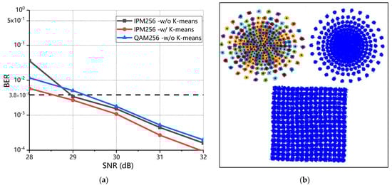 Figure 7a shows the BER performance of the proposed scheme, IPM-256 without K-means and QAM-256 when loop = 1. We could observe that when SNR = 28 dB, the BER performance of QAM-256 is superior to IPM, yet not as good as the proposed scheme. When SNR > 28.8 dB, the IPM-256 without K-means has a lower BER. For comparison, our proposed scheme acquires 0.4 dB and 0.8 dB, respectively, at the HD-FEC threshold, compared with IPM-256 without K-means and QAM-256. The results fully show that although IPM-256 is not as good as QAM-256 in resisting the influence of nonlinear effect, the system’s tolerance to nonlinear effect is improved after the application of the K-means algorithm.