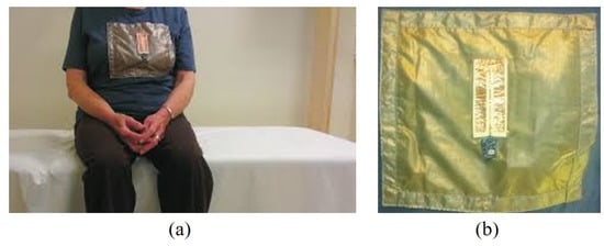 Wearable sensor settings during data acquisition: (a) positioning of the WISP sensor on the subject’s body, (b) the WISP sensor attached to the subject’s clothing with isolating silver fabric [].