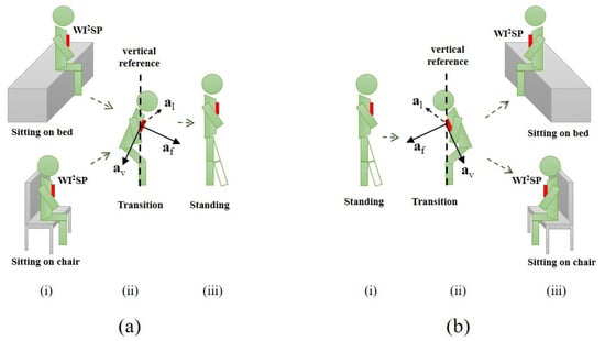 Experimental setting for data collection using WISP during activities: (a) sit-to-stand (Si2St); (i) sitting on the bed/chair, (ii) transition, (iii) standing; (b) stand-to-sit (St2Si); (i) standing, (ii) transition, (iii) sitting on the bed/chair.