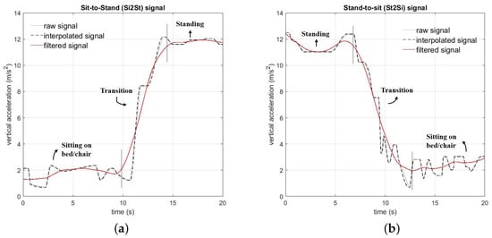 Raw, interpolated, and filtered vertical acceleration signal acquired from WISP while performing (a) Si2St and (b) St2Si.