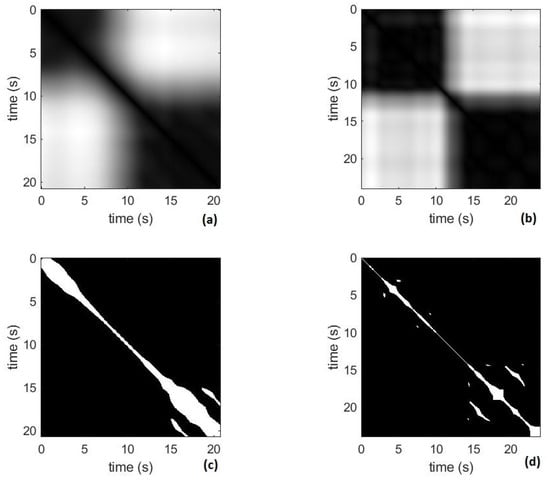 Figure 4a,b show the sample distance matrices and Figure 4c,d show the corresponding recurrence matrices calculated for the St2Si and Si2St activities.