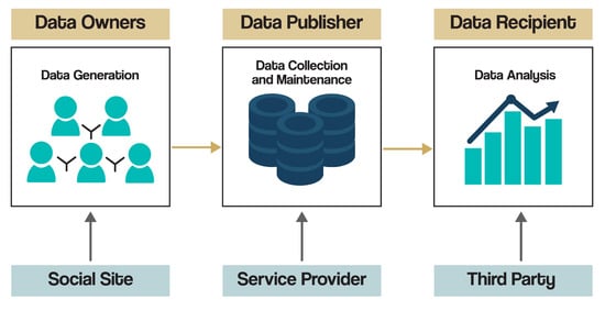Social networking sites have gained popularity due to the advanced features they provide to the users. Because of this popularity, people use social sites to connect with their friends and family, share their interests, and establish connections. The information about the user’s interest and the connection is publicly available to everyone, although a user can change their privacy settings and set the differential access to their private information []. By using the social networking sites, a user generates a massive amount of data daily. Social network service providers collect and maintain this generated data. Generated data is being published by network providers for research purposes which is useful in domains like marketing and survey, as shown in Figure 1. While making data publicly available, protection of the sensitive information becomes of the prime concern. In particular, social data contains a lot of important information, such as user contact details that must not be disclosed. Social data is typically published in the form of social graphs where each vertex is a representation of an individual and their links represent their connections. The problem with such types of data publishing is that the adversary easily gets the victim’s connection information (background knowledge) from their social media account and uses it to identify its victim on a published graph []. If the adversary successfully identifies its victim from a social graph, we say privacy is breached. A privacy violation [] is an action that exposes private or confidential information about an individual to the adversary. One common approach to provide defense against privacy breaches is simply removing user identities from a published graph []. However, this solution is not always appropriate due to the availability of useful information on different social sites. Adversaries intelligently apply different queries to get background knowledge about a user, such as number of connections, mutual connections, and connections among connections, etc.