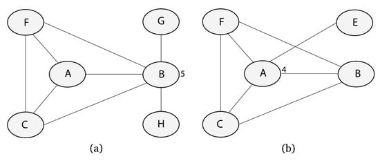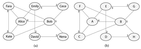 - k-neighborhood anonymity: The adversary uses background knowledge of its victim’s degree and neighbor connections to perform neighborhood attack and k-neighborhood anonymity is used to provide the defense []. Ref. [] proposed an algorithm to provide defense from neighborhood attacks by inserting links or vertices in the original graph until there are k vertices and their subgraphs becomes isomorphic. Ref. [] identified an attack called mutual friend attack that occurs due to disclosure of sensitive link between two vertices. Ref. [] proposed an algorithm (k-NMF) that adds extra links into the original graph and ensures that there must be at least other links with the same number of mutual friends.