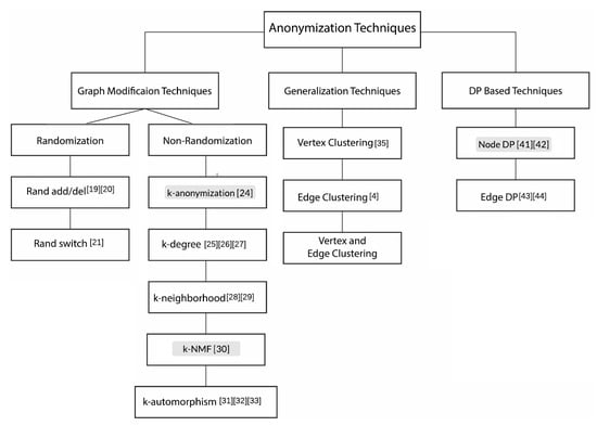 Social networking sites provide many attractive features to their users. People use these social sites for different purposes including sharing their data publicly with friends. Generated social data has huge commercial value as well as also containing sensitive information that needs to be protected. Social data should be properly anonymized to maintain the user’s data privacy before publishing. The adversary uses a range of background information about the target individual to infer its private information []. Background knowledge is referred to as information an adversary uses to perform any attack on a published dataset []. Many privacy-preserving techniques are introduced for social data publishing. These techniques are categorized as Graph Modification, Clustering, and Differential Privacy based techniques, which are shown in Figure 4. The main objective of privacy-preserving techniques is to conceal confidential details of individuals in the published dataset while maintaining its usefulness [].