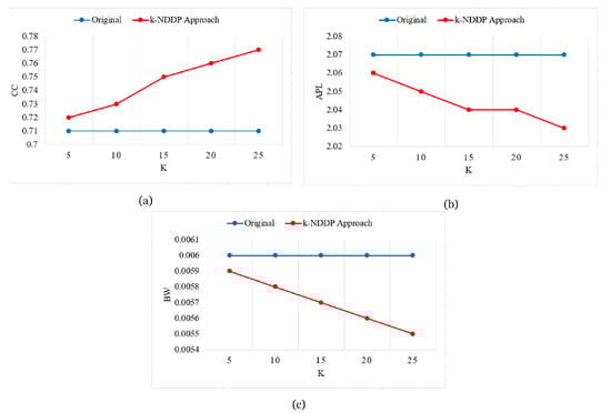 The utility of the proposed k-NDDP anonymization approach is inspected through the matrices listed above. The smaller difference between values of original data and achieved results, the more utility method preserves. Figure 7 represents the results of first experiment derived from different values of k for CC, APL and BW. For the first experiment, (FEATHER-DEEZER-SOCIAL) dataset is utilized, which is an undirected social graph. Figure 7a shows different values of CC for the original and anonymized graph. The constant line is the representation of the original value. After anonymization, the value of CC increases with increase of k, but the deviation between original and anonymized values is very little. The reason for this increase is the proposed methodology. The approach determines candidate vertices of link insertion, and a single inserted link fulfills the requirement of two vertices. This process makes density between the vertices and increases the value of CC. Figure 7b details the APL for the vertices of original and anonymized graphs. The horizontal constant line represents the APL of the original graph for different values of k. The value of APL, under the proposed k-NDDP approach, decreases with the increase of privacy parameter k as algorithm preserves shortest path information. Figure 7c shows the BW of the anonymized and original graph. The larger the value of BW, the more vertices dominate the graph. This indicates that the vertices with high BW have more control over the graph. After anonymization, the value of BW decreases, but the difference between original and anonymized results is very small. The results of second experiment for FEATHER-LASTFM-SOCIAL are shown on Table 3.