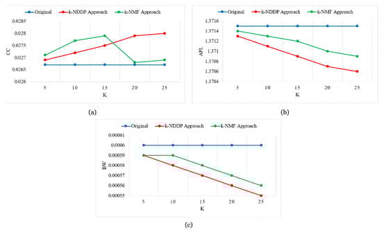 Now, for last experiment, SOCFB-USFCA72 dataset is utilized and its utility preservation with k-NMF is evaluated. The difference in CC for both approaches is shown in Figure 8a. After anonymization, the value of CC increases for both approaches. The original value of CC is 0.0267, and k-NDDP obtains 0.0272, while k-NMF obtains 0.0275 average value. Figure 8b represents the result of APL. For every value of k, k-NDDP preserves shortest path information, thus the value of APL comparatively decreases more in this approach. The actual value of APL for original dataset is 1.3715, after anonymization k-NDDP and k-NMF achieves 1.3711 and 1.3709 average value, respectively. BFS traversal for candidate vertex selection preserves the shortest path between two vertices and shows similar performance as k-NMF in terms of betweenness centrality shown in Figure 8c, as there is a negligible change between different values for k for both approaches (0.00056 and 0.00057). These results show that for different values of k, the divergence in CC, BW, and APL is not more than .
