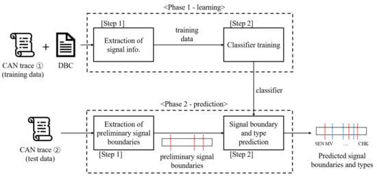 To mitigate the problem, a classification algorithm-based CAN reverse-engineering method (CA-CRE) is proposed in this paper to identify CAN message formats using a classifier. CA-CRE is composed mainly of two phases: the learning phase and prediction phase. In the first phase, a dataset to train a classifier is extracted from CAN traces, whose format information is already revealed. The dataset is a table, where each row represents nine feature values and a label of a signal (a field defined in DBC). The features are statistical values that can be extracted from CAN traces. They are chosen and devised to quantify the characteristics of signals. Then, the dataset is given to one of the machine-learning classification models as training data. In the second phase, prediction of signal boundaries for a CAN trace is performed. First, preliminary signal boundaries are extracted from the CAN trace. Then, the final signal boundaries are predicted within the preliminary boundaries using the classifier trained earlier.