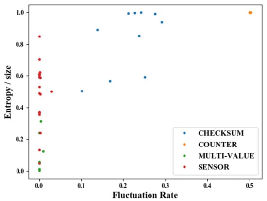 A combination of the features defined above can be used to differentiate between signal types. Figure 2 illustrates the FR‒entropy/size distribution of four types of signals from a real-world vehicle. FRs of the CHECKSUM signals are between 0.1 and 0.3. SENSOR and MULTI-VALUE signals exhibit low FR values, where the entropy/size values of SENSOR signals are generally larger than those of MULTI-VALUE signals. COUNTER signals show FRs of 0.5 or higher, because all COUNTER signals in the vehicle are 2-bit long. Intuitively, COUNTER signals seem to have lower FR values than CHECKSUM signals, but small-sized COUNTER signals have high FR values since the FR of an n-bit counter is 1/2n−1. Although there exist SENSOR signals that have lower entropy/size values than some of MULTI-VALUE signals, all four signal types are grouped together by the two features. Using the data above, the types of some unknown signals can be predicted. For example, if the FR of a signal is 0.001 and the entropy/size is 0.5, then the signal can be predicted to be a SENSOR signal. If a signal’s FR is 0.3 and the entropy/size is 0.99, the signal is highly likely to be CHECKSUM signal.