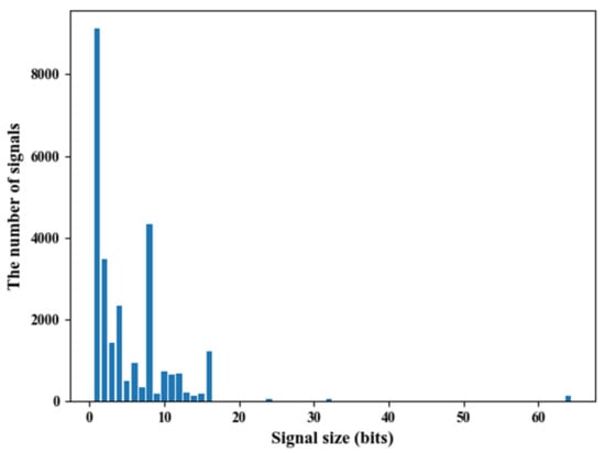 Distribution of sizes of all signals defined in the DBCs of OpenDBC [].
