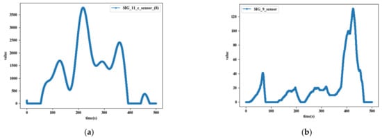 Table 3 outlines how the signals in the synthetic CAN dataset are generated. A CONST signal has a fixed value throughout the entire trace. A MULTI-VALUE signal has a value of 0 in most cases and shows a value greater than 0 with a small probability. A COUNTER signal has a pattern that starts from an arbitrary value and increases by 1, and when the value reaches a certain number, it returns to 0 and increases again by 1. A CRC signal always has arbitrary values. SENSOR signals have two types. A Type-1 SENSOR signal simulates SENSOR values based on a composite sine function. The individual sine function of the composite sine is arbitrarily selected within a certain range of amplitude, period, phase, and base, and the final value of the signal is created by adding these multiple sine values. Type-2 is intended to produce a sequence of values different from the composite sine function, which is assumed to add more diversity to the synthetic CAN traces. The (i + 1)th value of a Type-2 SENSOR signal is determined by adding delta to the i-th value. The delta changes continuously through the product of a random sample of standard normal distribution and a factor (a parameter to adjust the degree of change). Given that signal values may increase or decrease excessively when the delta is too biased, the delta is adjusted with a certain probability if the increase or decrease of the values continues over a certain number of times (for example, 1000 times). Figure 4 illustrates examples of synthetic SENSOR Type-1 and Type-2: (a) shows the values of an 8-bit SENSOR Type-1 signal and (b) shows the values of an 11-bit SENSOR Type-2 signal over time.