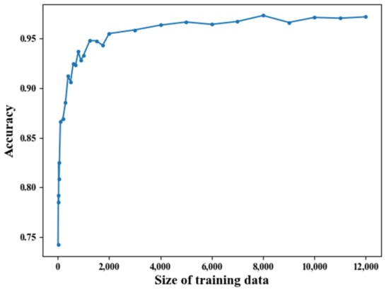 To estimate how sufficient the real-world dataset is, an additional experiment is performed by measuring accuracies of a classifier with different sizes of training data. Figure 5 shows the accuracies of a random forest classifier with different sizes of training data. The parameters of the classifier are identical to Table 9. For each size, training data are provided to the classifier by random sampling. Accuracy is measured on all the 4782 test data, regardless of the size of the training data. When the data size is 30 or less, accuracies are 0.8 or less. When the data size is approximately 2000 or more, accuracies are more than 0.95. This result suggests that at least 2000 samples of data should be provided to obtain the best performance from a classifier. Therefore, it can be interpreted that CA-CRE outperforms the previous works with only a limited number of samples (39 samples in this experiment) of training data.