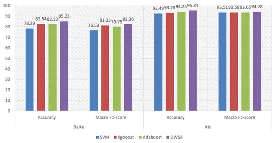 To test the generalization ability of our proposed classifier in DWSA in other fields, we use the public data set Baike2018qa [] and Iris [] to conduct the comparison. Please note that unlike the well-studied field of text semantic analysis and text classification, published work on document structural analysis is still scarce and public data sets similar to insurance documents that contain rich hierarchical information are hard to find. The Baike2018qa contains Chinese question-and-answer texts in various fields, which can be used for classification at sentence level. However, the Baike2018qa data set only has semantic information without other features such as font size, the font, coordinate position, and context spacing, etc. We select a subset of the data set. There are five categories (‘health’, ‘game’, ‘life’, ‘education’, and ‘entertainment’) with unbalanced samples. The Iris data set contains 3 categories, with each sample containing 4 features, which can be used for classification. The result is shown in Figure 6. The obvious better performance on our collected insurance data set than that on the public data sets can be attributed to the effective data pre-processing and feature engineering in our framework.