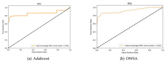 The Macro-average ROC curve of the Adaboost algorithm and The DWSA algorithm. (Insurance data set) (a) Adaboost; (b) DWSA.