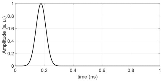 As mentioned in Section 1, in this study, the forward step in the EMTR technique is carried out experimentally. We used a vector network analyzer (VNA) in the range of 10 MHz–10 GHz to record the scattering parameter between the two monopole antennas in the frequency domain. The recorded scattering parameter is multiplied by the Fourier transform of the excitation signal (the Gaussian pulse shown in Figure 2 and the result is transformed into the time domain using the inverse Fourier transform.
