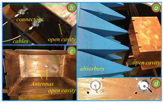Pictures of the open cavity used in the experimental setup are presented in Figure 3. To emulate the open boundary condition in the test environment, we placed an absorber in front of the open side of the cavity, as shown in Figure 3a. The working frequency of the absorbers is from 1 to 40 GHz. In this range, the maximum reflectivity of the absorbers is −24 dB. The two monopole antennas shown in the expanded view in Figure 3d are connected to the VNA from the back side of the open cavity as shown in Figure 3b. It should be noted that the calibration of the VNA was performed from the end of these connectors. Figure 3c shows a front view of the open cavity to illustrate the location of the two monopole antennas. The origin and the axes of the selected coordinate system can be seen in Figure 1.