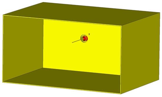 An expanded view of the two-monopole antennas is depicted in Figure 1b. The transducer and the source center positions are (8.96 cm, 6.66 cm) and (14.78 cm, 6.66 cm), respectively, in the x–y plane. The location of the EMI source antenna is in the Fresnel region (1.94λ at the maximum frequency (10 GHz) of the excitation bandwidth) of the sensor. The N-type connectors attached to the antennas are assumed to be lossless and with a relative dielectric permittivity of 2.25. The length of both antennas is 5.3 cm and they are made of copper (σ = 5.8 × 107 S/m). The material is modeled as copper (annealed) using the predefined material library in CST MWS.