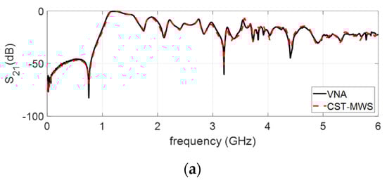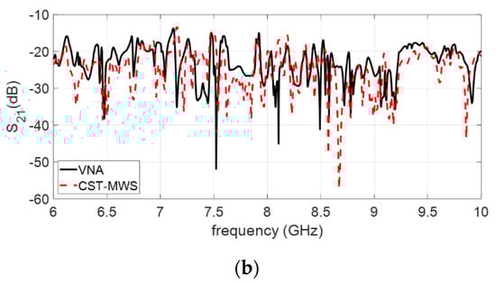 As seen in Figure 6a, there is an excellent agreement in the 0–6 GHz frequency range between the CST MWS simulations and the experimental data. For frequencies beyond 6 GHz, the agreement between the measured and simulated results deteriorates, essentially because of the effect of the antenna connectors and mismatches between the numerical model and the experimental setup.