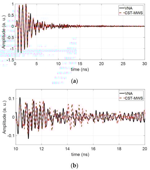 The time domain signal captured by the sensor can be obtained by multiplying the spectrum of the Gaussian pulse shown in Figure 2 by the scattering parameter S21 and applying the inverse fast Fourier transform. The result is depicted in Figure 7. The results obtained using CST MWS are also shown in that figure. It can be seen that the numerical simulations are in very good agreement with the experimental data (measured by the VNA), especially in the early times.