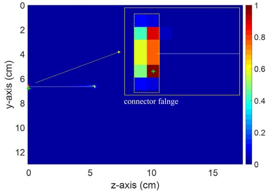 Figure 8 shows the distribution of the maximum normalized power for cut plane x = 14.78 cm in the matched-media case study. It can be seen that the maximum power occurs around the connector flange (that is, the feed point of the monopole antenna). A local maximum also occurs at the tip of the monopole antenna. The inset figure shows a zoomed view around the connector flange, where the global maximum power occurred. As can be seen from Figure 8, the EMTR method can localize the feed point of the antenna with high accuracy.