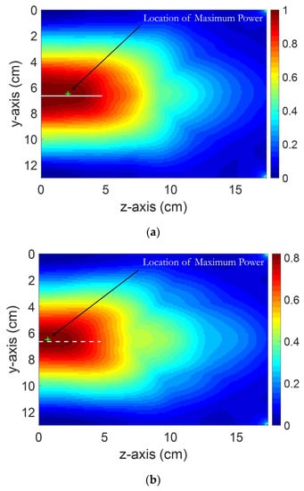 In Figure 10a,b, the distribution of the maximum power is shown at cut planes y = 6.66 cm (coincident with the x–z plane where the monopole source antenna is located) and y = 8.74 cm, 2 cm (2λ/3 at the maximum frequency of the excitation bandwidth) away from the monopole source antenna plane, respectively. In these cut planes, a 6.5 × 8.5 cm2 mask was used to remove the effect of the enhancement of the power near the sensor.