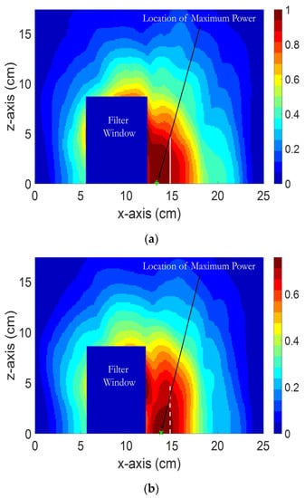 In Figure 9a,b, the distribution of the maximum power is shown for cut planes x = 14.78 cm (coincident with the x–z plane where the monopole source antenna is located) and x = 16.78 cm, 2 cm (2λ/3 at the maximum frequency of the excitation bandwidth), respectively, away from the monopole source antenna plane. It can be seen in Figure 9a,b that the maximum power of the back-propagated wave decreases as the distance from the source increases.